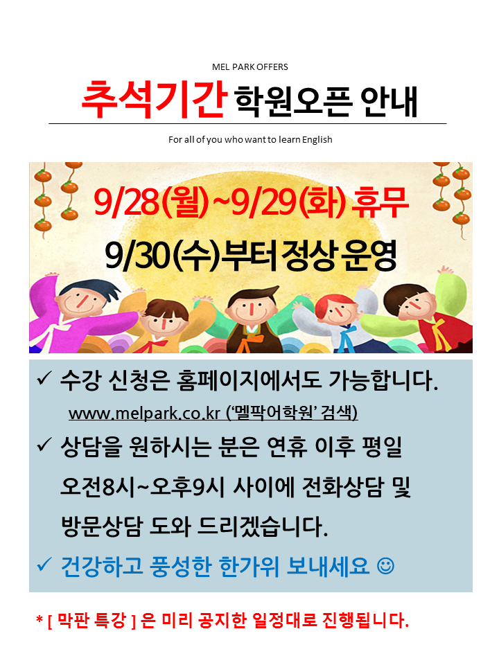 공지 | 멜팍어학원 추석연휴 오픈안내