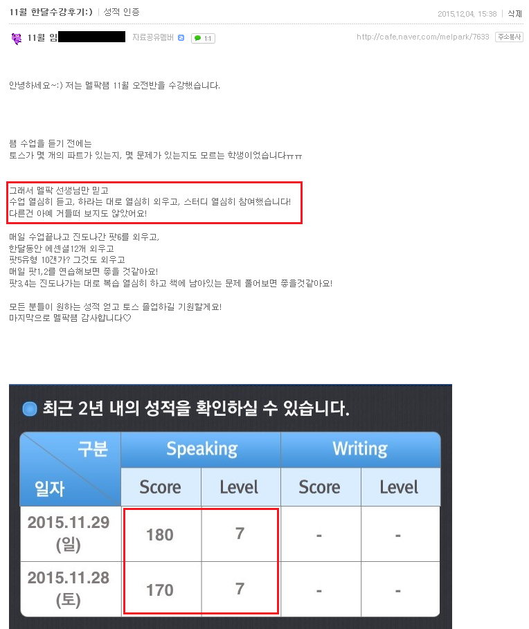 토스 | (대구토스 7급후기)선생님만 믿고 하라는대로 했더니^^ 한달 180점 7급 획득!! 페이지 정보 작성자 MELPARK 작성일15-12-07 17:04 조회4,396회 댓글0건 이전글 다음글 목록 본문 (클릭 하시면 크게 보실 수 있습니다.) 수강생 후기 입니다. 더 많은 후기는 우측 카페 링크 가입 후 보실 수 있습니다. 이전글 다음글 목록