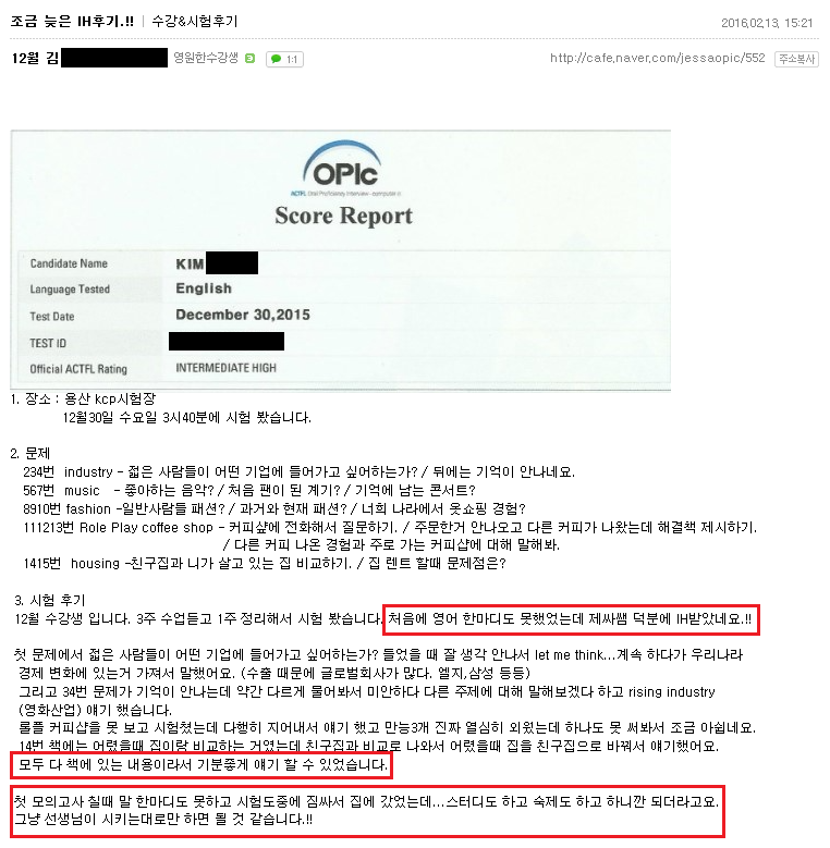오픽 | (대구오픽 IH후기) 처음에 영어 하나도 못했는데..선생님 덕분에 IH 획득!! 페이지 정보 작성자 MELPARK 작성일16-02-17 11:22 조회4,076회 댓글0건 이전글 다음글 목록 본문 (클릭 하시면 크게 보실 수 있습니다.) 수강생 후기 입니다. 더 많은 후기는 우측 카페 링크 가입 후 보실 수 있습니다. 이전글 다음글 목록